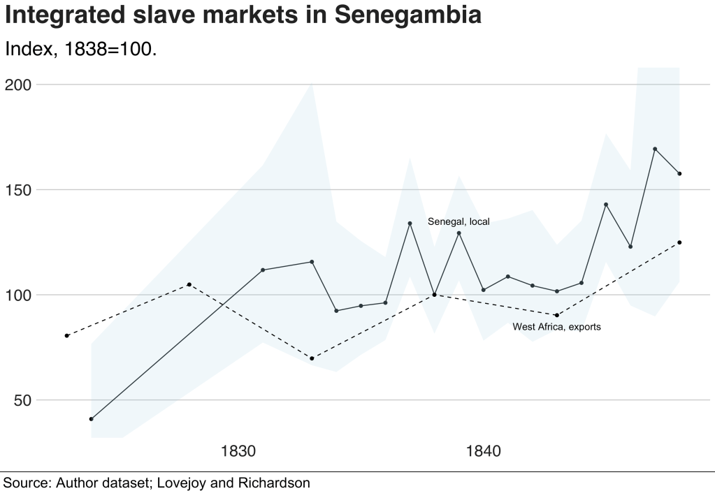 Recently Martin Klein wrote an interesting article suggesting that the functioning of urban slave labour markets in Africa require more theorising, and (fortunately, since a chapter of my dissertation is on precisely this subject) I agree. One question worth exploring is a subset of the more broader question of market integration: were domestic African markets for enslaved labour integrated with the broader trans-Atlantic slave trade? Paul Lovejoy and David Richardson argued about twenty-five years ago that they were integrated, rejecting Emmanuel Terray’s thesis that they were two essentially distinct and unconnected markets. But Lovejoy and Richardson’s conclusion was based on a very sparse dataset, based entirely on observations from European travellers. One of the findings of my own work is that at least in European coastal enclaves, like Saint Louis and Gorée in Senegal, real slave prices in the domestic slave market moved in tandem with coastal prices in the transatlantic slave trade. As Bronwen Everill has argued, these Afro-European towns were very much part of a broader Atlantic economy, and price history can help us demonstrate this: