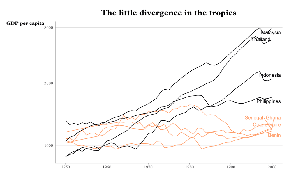 One of the less remarked upon ‘divergences’ in the economic history literature is the ‘Little’ Divergence between West Africa and Southeast Asia in the twentieth century. Up until around the 1970s, the differences in income between the two regions were not large. But after that point, Southeast Asia grew much quicker. Some Southeast Asian countries—Laos, Cambodia, Myanmar—have followed a more ‘West African’ path, but broadly speaking the divergence in striking.