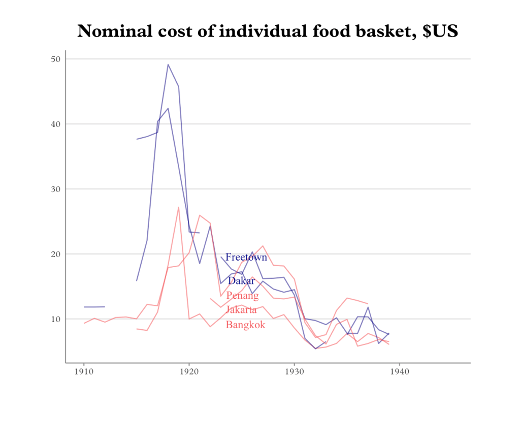 This table makes it easy to see that generally speaking, Freetown and Dakar were more expensive than the three Southeast Asian towns to which I have compared them, with the exception of Penang, which was somewhat cheaper than Dakar for parts of the 1920s and 1930s.