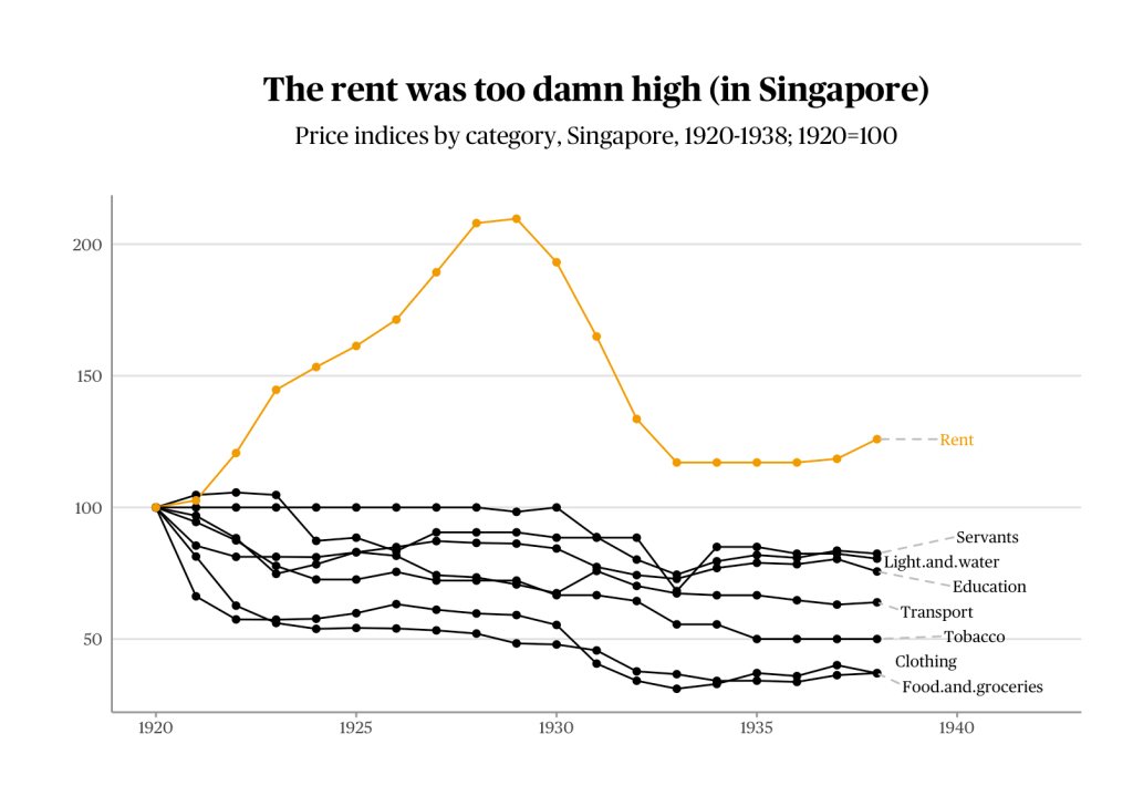 As my more devoted readers know, I am very interested in the relationship between housing costs and historical living standards and have shown that incorporating estimates of housing costs in a measure of the real wage in colonial Dakar makes a substantial difference to the story. I’m trying to accumulate more evidence for the proposition that housing costs matter, and in particular the proposition that housing costs likely swallow up a substantial fraction of the increase in real urban income in cities in developing countries where housing supply is relatively inelastic. One part of the developing world which is relatively easy to demonstrate this for, it turns out, is colonial Singapore, for which the British authorities compiled a set of price indices that were disaggregated by category. Choy and Sugimoto, in their study of real wages in Singapore, seem not to make use of this index, though they use the weights from the overall price index to slightly bump up the rental share of the consumer basket they use to construct their own price indices. They find a generally stagnant real wage for unskilled workers in Singapore, even during the rubber boom of the 1920s, though a very pronounced increase in the real wage for skilled labourers.